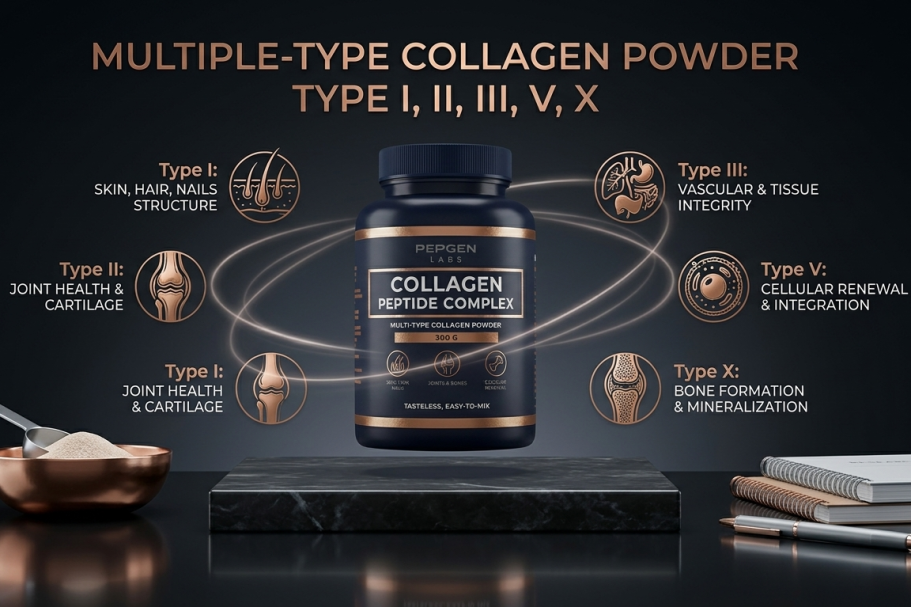 Collagen Peptide Complex harnesses hydrolyzed types I, II, III, V, X (2-5 kDa) for systemic support. This unflavored powder dissolves seamlessly, fueling skin elasticity, hair thickness, nail strength, and joint mobility. Click for details